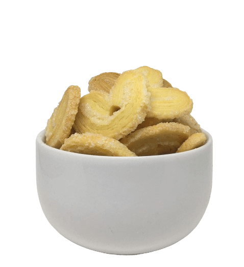 Biscoito agridoce super leve de massa folhada. Coberto por açúcar cristal. Produto vendido à granel